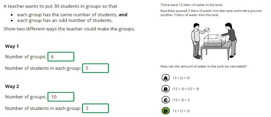 Verder dient nog opgemerkt te worden dat er discrepanties zijn tussen het binnen TIMSS aangehouden curriculum dat de basis vormt voor het ontwikkelen van de toets, en het in Nederland vigerende curriculum. Uit de door TIMSS uitgevoerde Test-Curriculum Matching Analysis (Von Davier et al., 2024; Appendix C, Exhibit C.2) blijkt dat de score voor Nederland 6 punten hoger uitgevallen zou zijn (543 in plaats van 537) als alleen de toetsopgaven waren meegerekend die corresponderen met het Nederlandse curriculum. Dit in tegenstelling tot bijvoorbeeld de Angelsaksische landen waarvoor geldt dat het TIMSS-curriculum vrijwel naadloos aansluit bij het nationale curriculum in die landen. In de analyse van Meelissen et al. van de TIMSS-resultaten van 2019 werd hier ook al een opmerking over gemaakt: ongeveer 73% van de TIMSS-toetsopgaven bleken in dat jaar aan te sluiten bij het Nederlandse curriculum (Meelissen et al., 2020, p.121). Bij de TIMSS-toets in 2023 lag dit percentage iets hoger, namelijk op 80% (Meelissen et al., 2024a, p.49). Dit betekent dat de Nederlandse leerlingen bij het maken van de toets in beide afnamejaren regelmatig tegen een type opgaven aanliepen dat in de rekenlessen niet was behandeld. Zie de twee voorbeelden[7] in afbeelding 4, afkomstig uit Mullis et al., 2020.