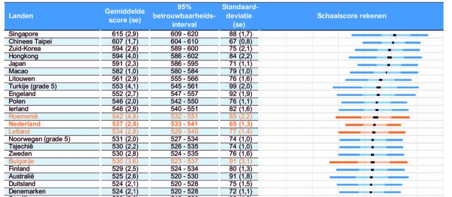 Opvallend is dat Nederland op de hele ranglijst een van de kleinste standaarddeviaties heeft, hetgeen erop wijst dat de verschillen tussen de zwakst en best presterende leerlingen in ons land relatief klein zijn. In vergelijking met voorgaande TIMSS-onderzoeken is de Nederlandse positie op deze ranglijst overigens nauwelijks veranderd – in 2019 bijvoorbeeld stond ons land met een score van 538 op de 14e plaats, één plaats lager dan in 2023.