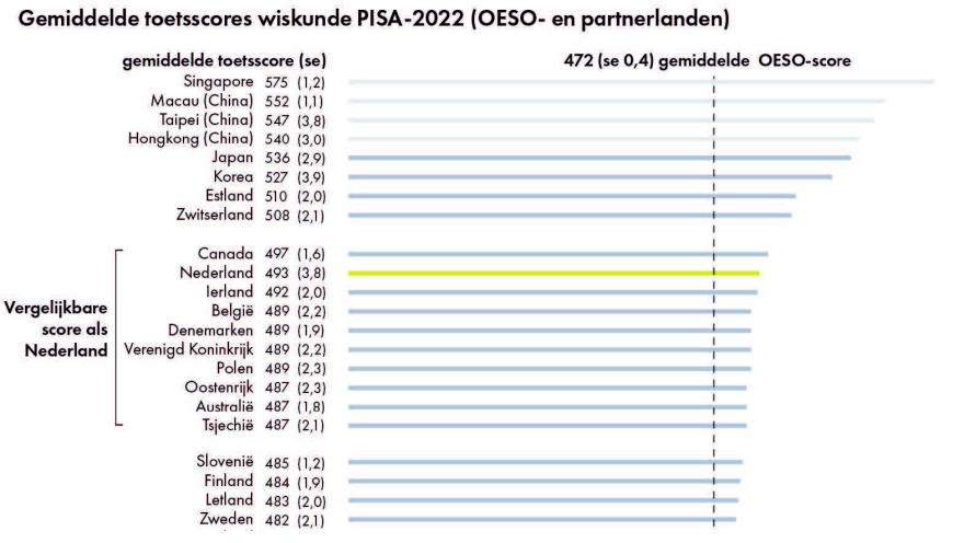 Kijken we vervolgens nog naar de leerresultaten van het PISA-onderzoek van 2022, dan kan ook daar vastgesteld worden dat Nederland qua prestatieniveau voor 15-jarige leerlingen in het voortgezet onderwijs (wiskunde[9]) eveneens in de subtop van de mondiale ranglijst zit (Meelissen et al., 2023). Zie afbeelding 5; het totale aantal deelnemende landen bedroeg 81.