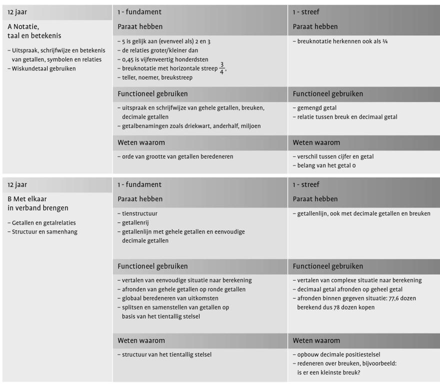 Nu valt het ook in meer algemene zin natuurlijk te bezien in hoeverre het Referentiekader 17 jaar na dato toe is aan een zekere mate van actualisering en herijking. Zijn er bepaalde leerstofonderdelen waarvan de beheersing minder relevant is (geworden) voor een soepele overgang van basis- naar voortgezet onderwijs dan destijds werd aangenomen? Zijn er andere soorten leerstof of leerdoelen die anno 2025 in het kader opgenomen zouden moeten worden? Is de dubbele inkadering van de leerinhouden zoals die in het Referentiekader wordt gehanteerd (met voor elk domein een dubbele drieslag aan inhoudsaspecten en beheersingsdoelen; zie het voorbeeld in afbeelding 7) nog wel actueel?