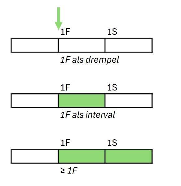 We hebben gemerkt dat het lastig is om te communiceren over de referentieniveaus. Een voorbeeld hiervan is de ambiguïteit van 1F en 1S als drempelwaardes of intervallen. Als drempelwaardes zijn ze punten op een vaardigheidsschaal: een leerling kan links of rechts van de drempel 1F of 1S scoren (bovenste situatie in afbeelding 1). Maar in de rapportages van de inspectie worden ze als intervallen gerapporteerd (een bepaald percentage leerlingen heeft 1F behaald (middelste situatie in afbeelding 1). In het geval van 1F is er de extra complicatie dat 1F soms als alleen als interval tot 1S wordt opgevat (dus wel 1F maar niet 1S halen) en soms als alles vanaf 1F (dus minstens 1F halen, ook wel genoteerd als >1F of ≥1F, zie de onderste situatie in afbeelding 1). Merk verder op dat de plaatjes in leerlingvolgsystemen (bijvoorbeeld van ‘Leerling in Beeld’) er weer anders uitzien, namelijk een gekleurde balk tot aan de behaalde score in een interval. De reden hiervoor is dat in leerlingvolgsystemen een gekleurde balk de score van een individuele leerling representeert, niet het percentage leerlingen dat een bepaald niveau haalt.