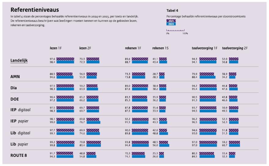 Niet alleen is de drempelwaarde van 1S onvoldoende gefundeerd, de cijfers die we nu gebruiken uit de doorstroomtoetsen blijken onbetrouwbaar te zijn. Er zijn grote verschillen tussen doorstroomtoetsen in percentages 1F en 1S/2F, zowel bij rekenen als bij taal (afbeelding 2, CvTE, 2025). Bij Route 8 haalde 25,3% van de leerlingen 1S voor rekenen, terwijl dat bij Lib (Leerling in beeld) op papier 48,5% was. Dat is ruim 23 procentpunt verschil, of anders gezegd: bijna twee keer zo veel.