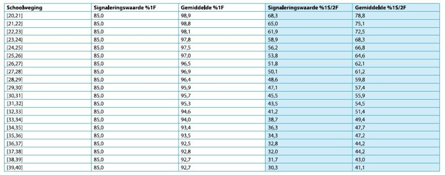 Zoals eerder beschreven was het referentiekader niet bedoeld voor uitspraken over individuele scholen (Expertgroep, 2009b). Ook in 2023 stelde toenmalig minister Wiersma (2023) in een brief over het masterplan basisvaardigheden: ‘Wel wil ik opmerken dat beleidsdoelen geen doelen zijn voor individuele scholen’ (p. 7). Toch is dat precies wat er nu gebeurt vanwege de wettelijke invoering van het referentiekader (Hooge, 2014). Voor elke basisschool berekent de inspectie jaarlijks op basis van de eindtoetsen (vanaf 2023–2024 de Doorstroomtoets) of het 3-jaarsgemiddelde van de leerresultaten voldoende of onvoldoende is (Inspectie van het Onderwijs, 2024b). Op de website https://scholenopdekaart.nl kan iedereen open data van elke school inzien. De inspectie rapporteert verder signaleringswaarden voor de percentages leerlingen die de referentieniveaus voor rekenen en taal halen (1F en 1S/2F), afhankelijk van de schoolweging, op 1 decimaal nauwkeurig (afbeelding 3). De inspectie beoordeelt de leerresultaten van een school als onvoldoende als de behaalde percentages voor een of beide indicatoren van de referentieniveaus 1F en 1S/2F onder de signaleringswaarde liggen, al kan de verantwoording van de school daar nog wat aan veranderen.
