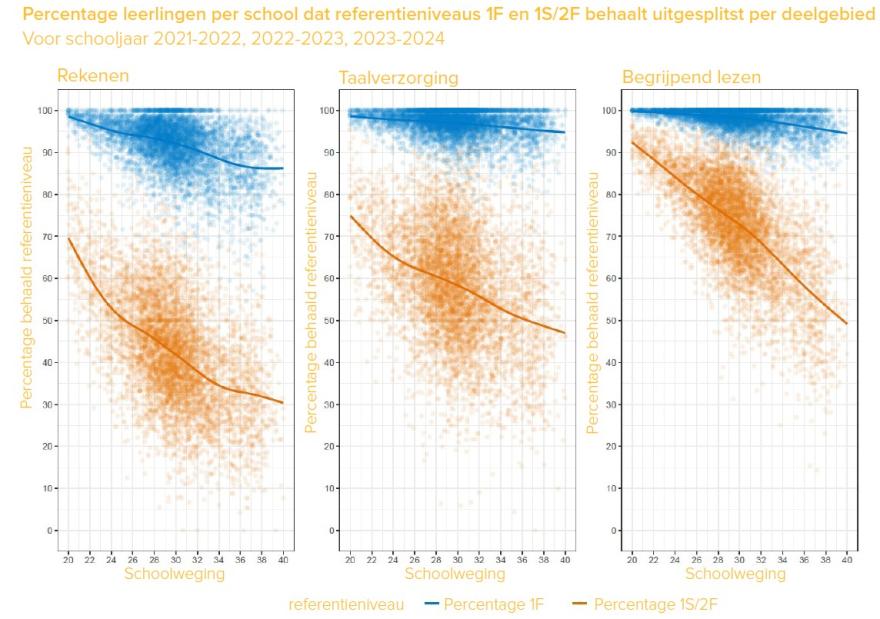 Eindtoetsen en doorstroomtoetsen vormen dus een andere informatiebron om een beeld te krijgen van de leerresultaten. De percentages leerlingen die op deze toetsen 1F halen, schommelen sinds de invoering rond de 90%, terwijl de percentages leerlingen die 1S halen rond de 45% liggen (Buijs, 2024).